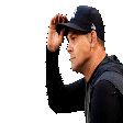 A man wearing a New York Yankees baseball cap looks intently through binoculars, standing against a plain white background.