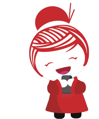 Yao Rd Kora, a cheerful red cartoon character, smiles broadly while happily holding and interacting with her glowing smartphone.