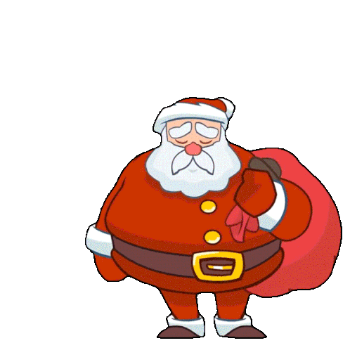 Cartoon Santa Claus with a white beard and red suit, yawning happily while holding a red gift bag over his shoulder.
