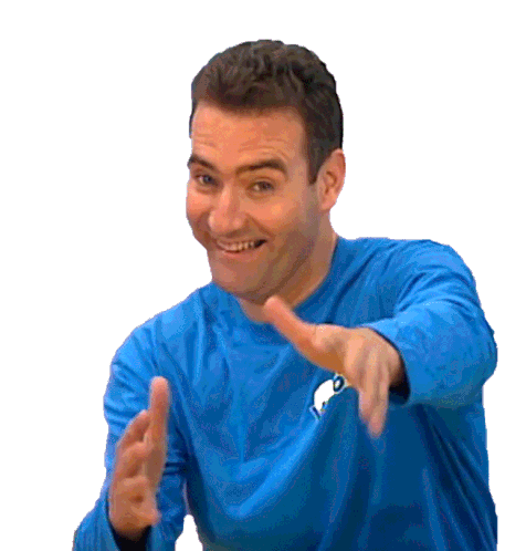 Anthony Wiggle from The Wiggles shows off his spirit fingers with an enthusiastic 'Yay!' reaction, perfect for celebrations.