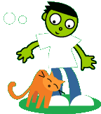 A cheerful PBS Kids cartoon character, Dash, stands beside a cute orange cat, creating a friendly scene.