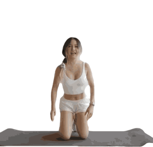 Chloe Ting celebrates with an excited 'yay' gesture, kneeling on a yoga mat after a workout or stretch session.