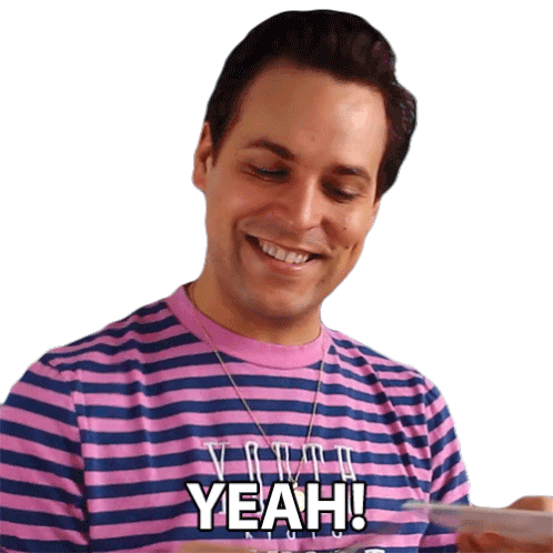 Bry, a man in a pink and blue striped shirt, smiles and enthusiastically says 'Yeah!' in this animated sticker.