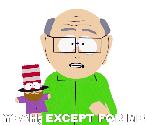 Mr. Garrison from South Park expresses his exclusion with the phrase 'Yeah, Except For Me' while holding Mr. Hat.