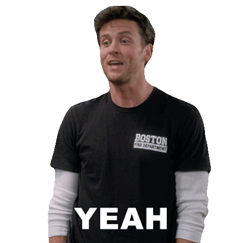 Freddy Crane, wearing a Boston Fire Department shirt, smiles broadly and enthusiastically says 'Yeah'.