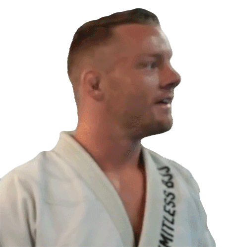 Jordan Preisinger in a white gi saying 'Yeah' with a confident expression, ready for action.