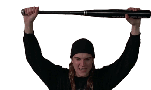 Jay (Jason Mewes) from Mallrats cheers enthusiastically, holding a baseball bat above his head with a wide, happy laugh.