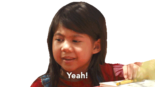 Lilo, portrayed by Maia Kealoha, from Disney's Lilo & Stitch, smiles and says 'Yeah!' while holding a yellow crayon.