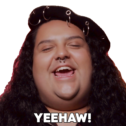 Mistress Isabelle Brooks joyfully exclaims "Yeehaw!" with a wide smile, showcasing her excited reaction.