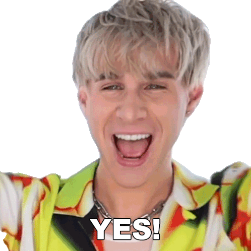 Brad Mondo, with short blonde hair and a colorful shirt, enthusiastically shouts 'YES!' with his eyes closed and arms raised.