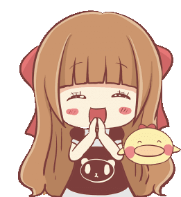 Centilia, a happy anime girl with long brown hair, claps her hands excitedly alongside her cute yellow duck friend.