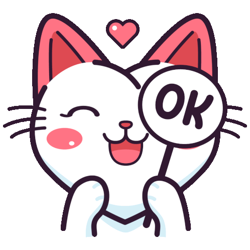 A cute cartoon cat with pink ears and a heart above its head, happily holding an 'OK' sign.