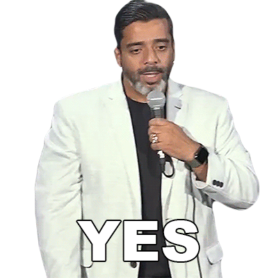 Jeeveshu Ahluwalia, the comedian, holding a microphone and emphatically saying 'Yes' on stage.