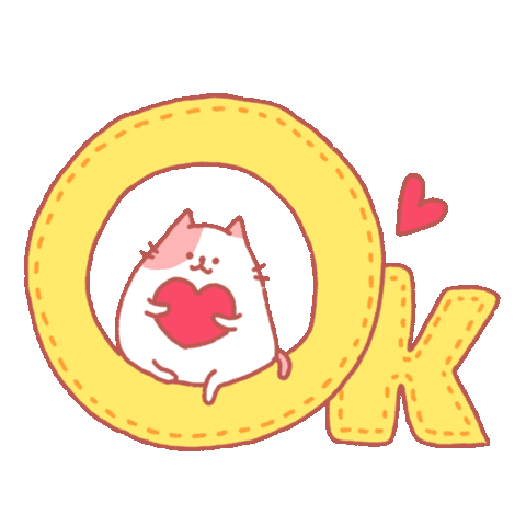 Adorable chubby cat holding a heart inside a yellow 'O', with a 'K' and another heart, conveying a sweet 'OK' or 'Yes'.