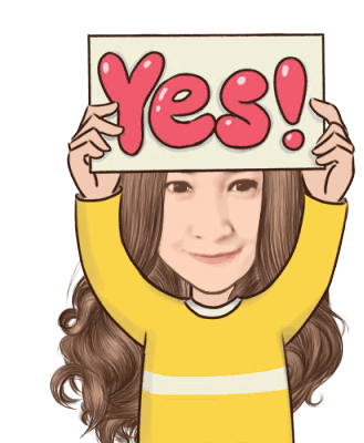 An animated cartoon girl with long hair smiles while holding up a sign that enthusiastically says "Yes!".