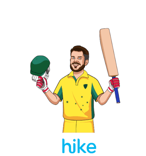 An animated Australian cricketer in a yellow uniform celebrates a victory, holding a bat and helmet with a triumphant pose.