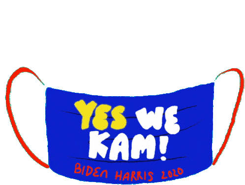 A blue face mask featuring the 'Yes We Kam!' slogan and 'Biden Harris 2020' for the US election campaign.