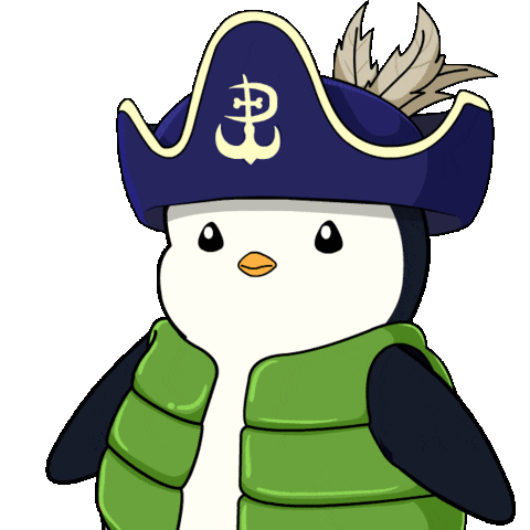 A cute Pudgy Penguin wearing a pirate hat and green vest nods in agreement, displaying 'OKAY' on its chest.