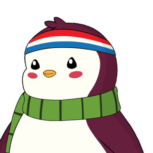 A cute pudgy penguin, wearing a headband and scarf, nods happily in agreement, expressing 'Yes, please!'