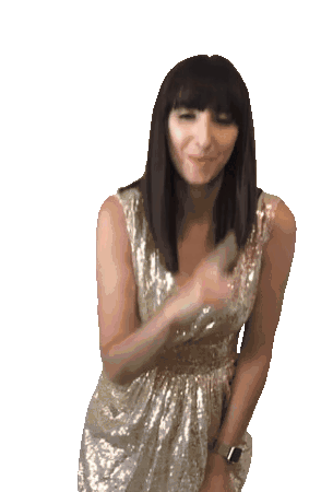 Jenn Robbins, the 'Yes Girl,' in a sparkling gold sequined dress, gives a joyful thumbs up with a playful expression.