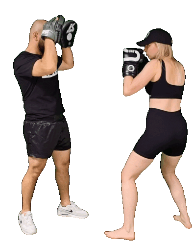 Yesfit Jamal and a woman engage in boxing training, practicing punches and defense.