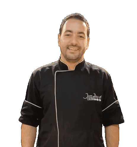 Chef Juan David Cocina claps enthusiastically and gives a double thumbs up, radiating happiness and positive energy.