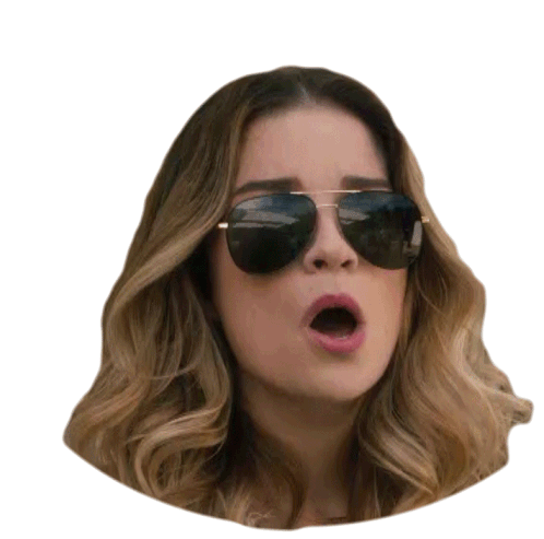 Alexis Rose from Schitt's Creek reacts with a surprised 'yikes' expression, wearing aviator sunglasses.