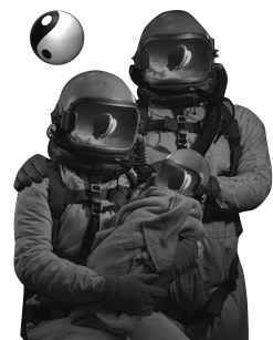A surreal black and white sticker featuring an astronaut family, including a baby, with seashells visible in their visors, alongside a Yin Yang symbol.