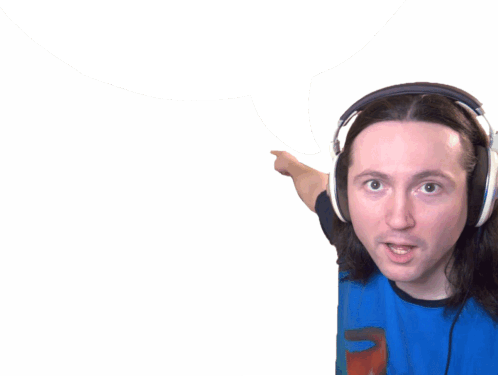 a man wearing headphones and a blue shirt is pointing at something
