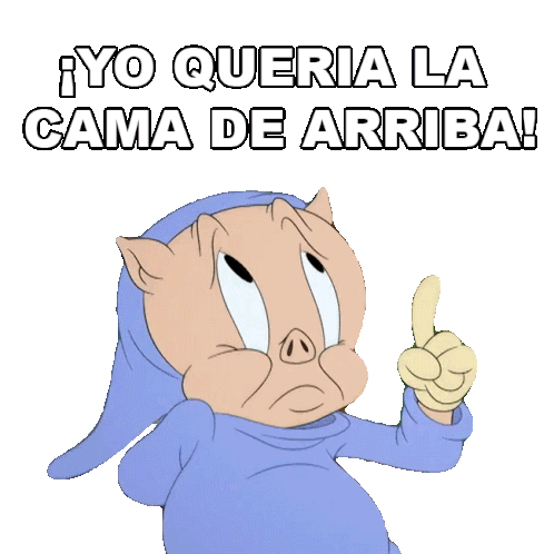 Porky Pig, dressed in blue pajamas, points upwards and exclaims in Spanish, "I wanted the top bunk!"