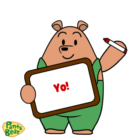 Pantsbear, the friendly cartoon bear, greets with a cheerful 'Yo!' written on a whiteboard, perfect for casual hellos.