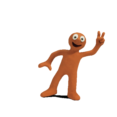 a cartoon character giving a peace sign in front of an orange y and p