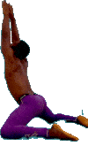 A man in purple pants performs a kneeling yoga pose, stretching his back with arms raised.