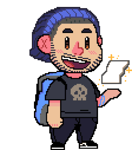 Yondoncb, a pixel art man with a skull shirt and blue beanie, happily holds a glowing piece of paper.