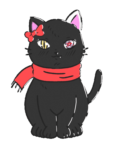 Cute black cat sticker, Yoruchi よるち, with a red bow, scarf, and unique magic eyes that blink.