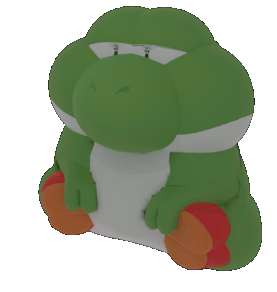 A plush Yoshi toy with a melancholic expression sits on a white background, gently swaying. Perfect for expressing sadness or contemplation.