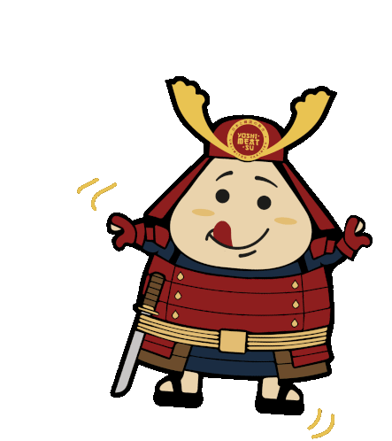 Yoshimeatsu samurai mascot waves happily, licking its lips, ready for some delicious yakiniku or samgyup.