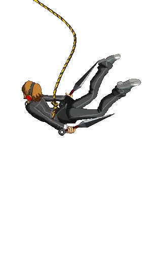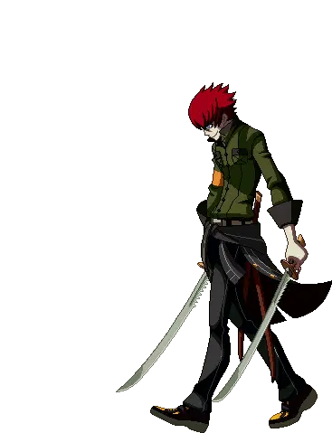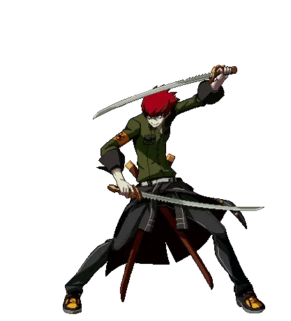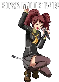 Yosuke Hanamura from Persona 4 Arena Ultimax, depicted in pixel art, kneels while holding two sharp kunai-like weapons.