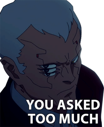 Faraday from Cyberpunk Edgerunners with the text 'You Asked Too Much', expressing frustration or disapproval.