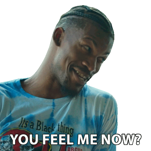 Jimmy Butler, wearing a tie-dye shirt, asks 'You Feel Me Now?' with a knowing look, then laughs.