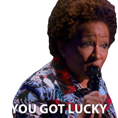 Comedian Wanda Sykes on stage, holding a microphone and saying "You Got Lucky".
