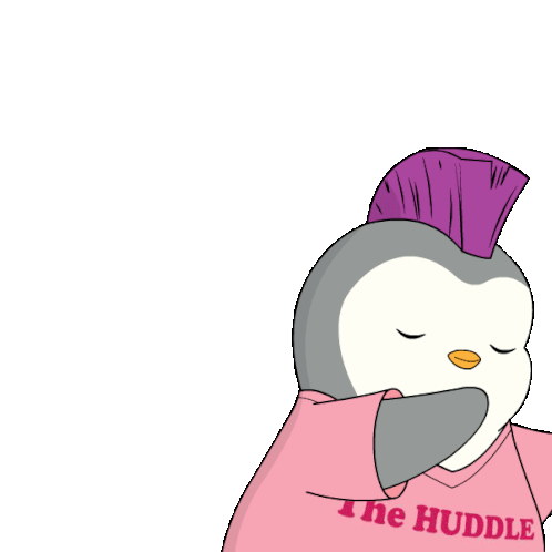 A cute Pudgy Penguin with a purple mohawk dabs and winks, wearing a pink "The Huddle" shirt, showing encouragement.