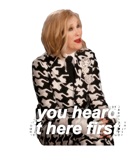 Moira Rose, portrayed by Catherine O'Hara, delivers a knowing look with the caption 'you heard it here first'.