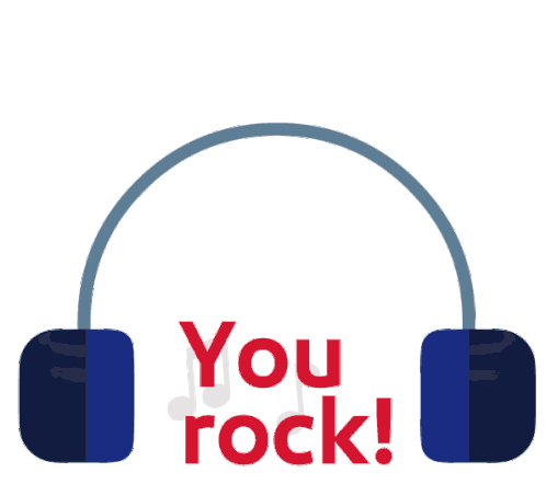 Animated sticker of blue headphones with the text 'You rock!' and musical notes floating around.