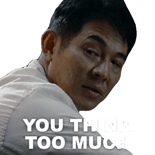 Jet Li from The Expendables looks over his shoulder with a skeptical expression, displaying the caption "YOU THINK TOO MUCH."