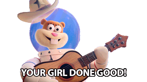 Sandy Cheeks from Spongebob Squarepants proudly holds her guitar, exclaiming 'Your girl done good!' with a big smile.