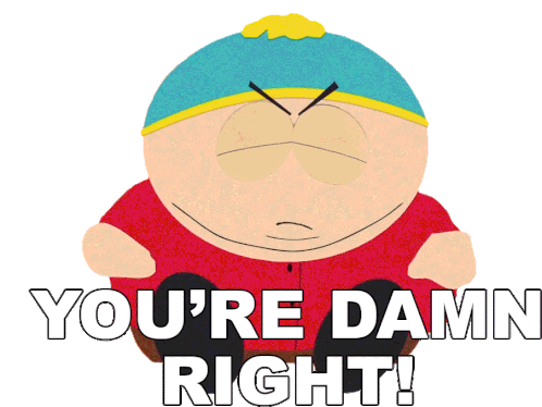 Eric Cartman from South Park asserts "You're Damn Right!" with a determined expression and pointing finger.