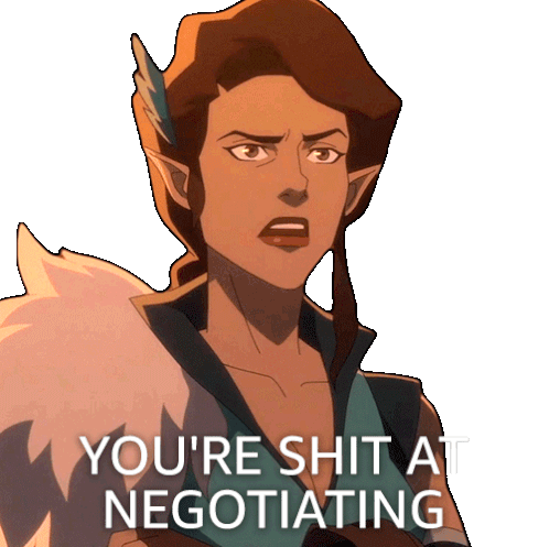 a cartoon character says " you 're shit at negotiating " in front of a white background