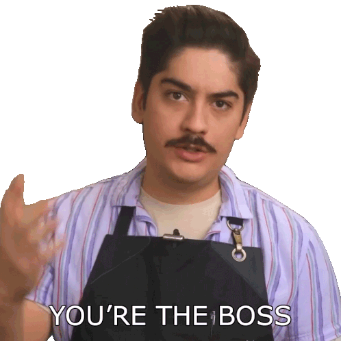 Internet Shaquille, a man with a mustache and apron, confidently declares 'You're The Boss' with a hand gesture.
