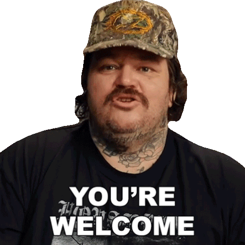 Matty Matheson, wearing a camo hat, says 'You're Welcome' with an open mouth expression.